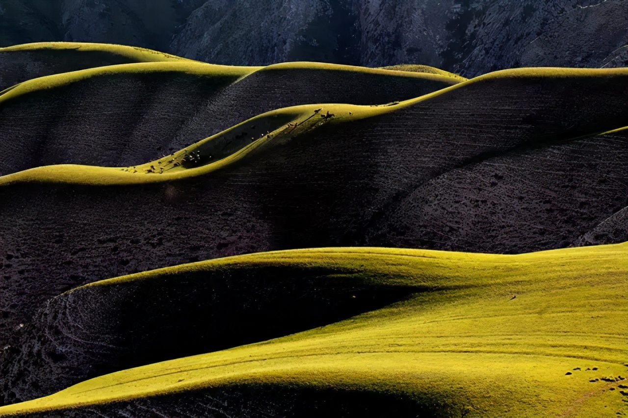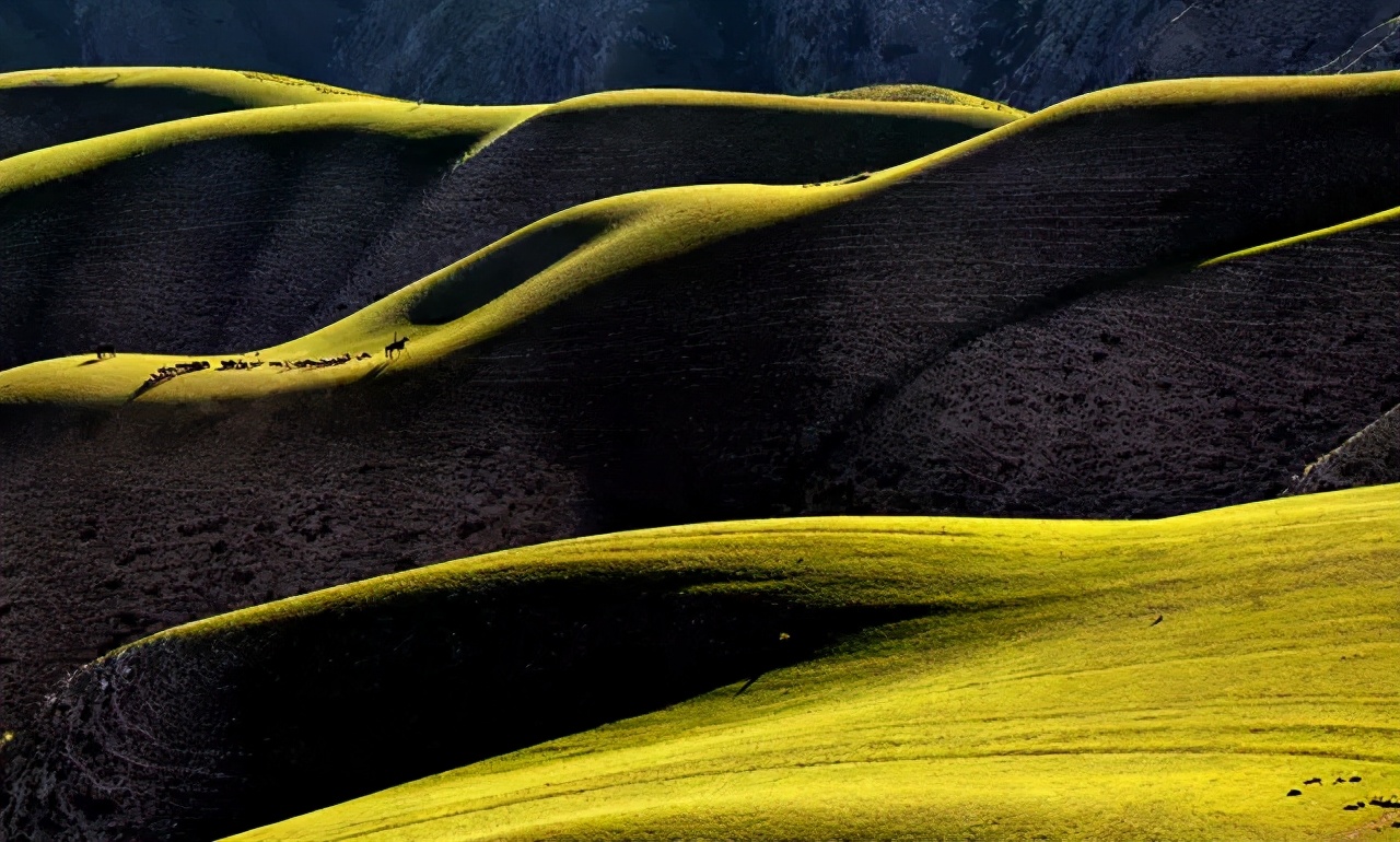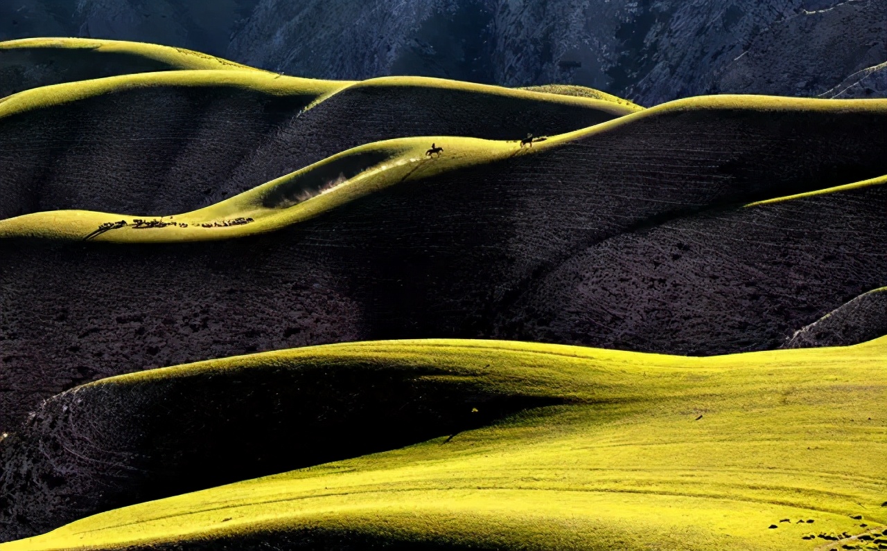 你以為這樣的喀拉峻已經(jīng)足夠美,不不,這些其他草原也有,不足為奇,下面才是獨(dú)一無(wú)二的驚艷!群山起伏成極富韻律的曲線,如大海掀起的層層波浪,為茫茫草原平添一份奇特動(dòng)感的美,只一眼就震撼到失了言語(yǔ)。