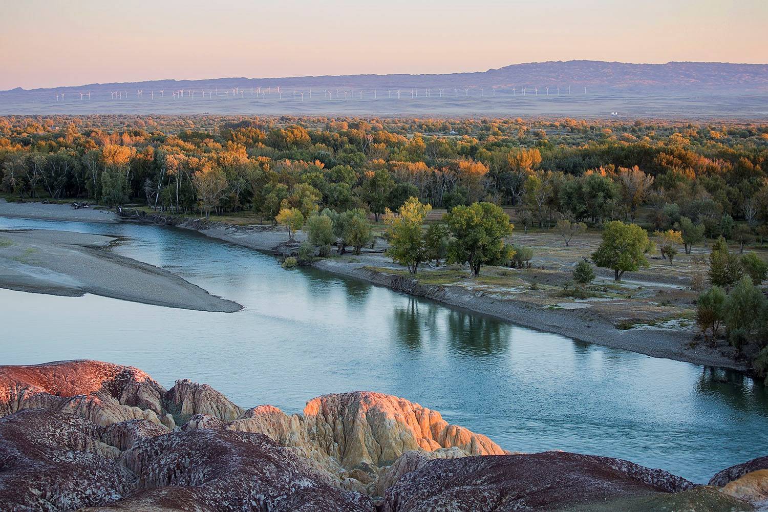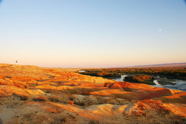 它毗鄰碧波蕩漾的額爾齊斯河,與對岸蔥郁青翠的河谷風(fēng)光遙相輝映,可謂“一河隔兩岸,自有兩重天”。激猛的河流沖擊以及狂風(fēng)侵蝕,形成了北岸的懸崖式雅丹地貌,河岸巖層抗風(fēng)化能力強弱不一,輪廓便會參差不齊,而巖石含有礦物質(zhì)的不同,又幻化出種種異彩,因此得名“五彩灘”。而南岸卻是綠樹葳蕤,連綿成林,遠(yuǎn)處逶迤的山巒與戈壁風(fēng)光盡收眼底。