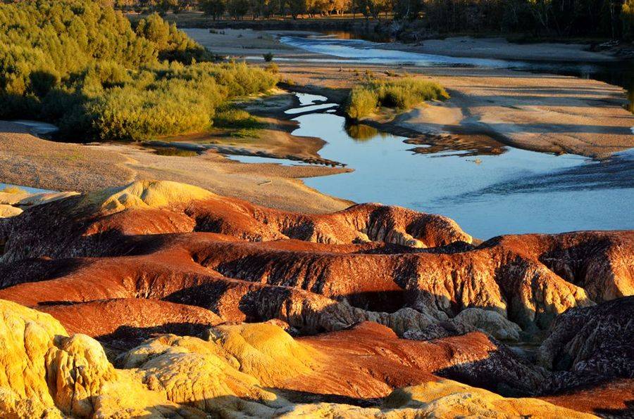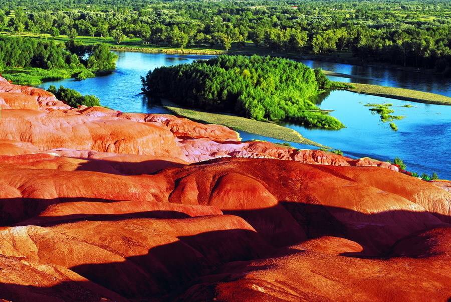 五彩灘的特別,還由于它色彩絢爛,形狀繽紛。因為這里有侏羅紀(jì)時代的煤層,經(jīng)過千萬年風(fēng)蝕雨剝以及河水的沖刷,在幾乎寸草不生的河灘上出現(xiàn)了紅、綠、紫、黃、棕等鮮艷的色彩。在河水的映襯和夕陽的照射下,當(dāng)你走進這高低起伏的“ 丘陵 ”地帶,就如同走進一個五彩斑斕夢幻般的世界,那些光怪陸離的色彩從四面八方撲面而來,都是那么明快、那么強烈、那么豐富多彩,真讓你感到目不暇接,眼花繚亂。